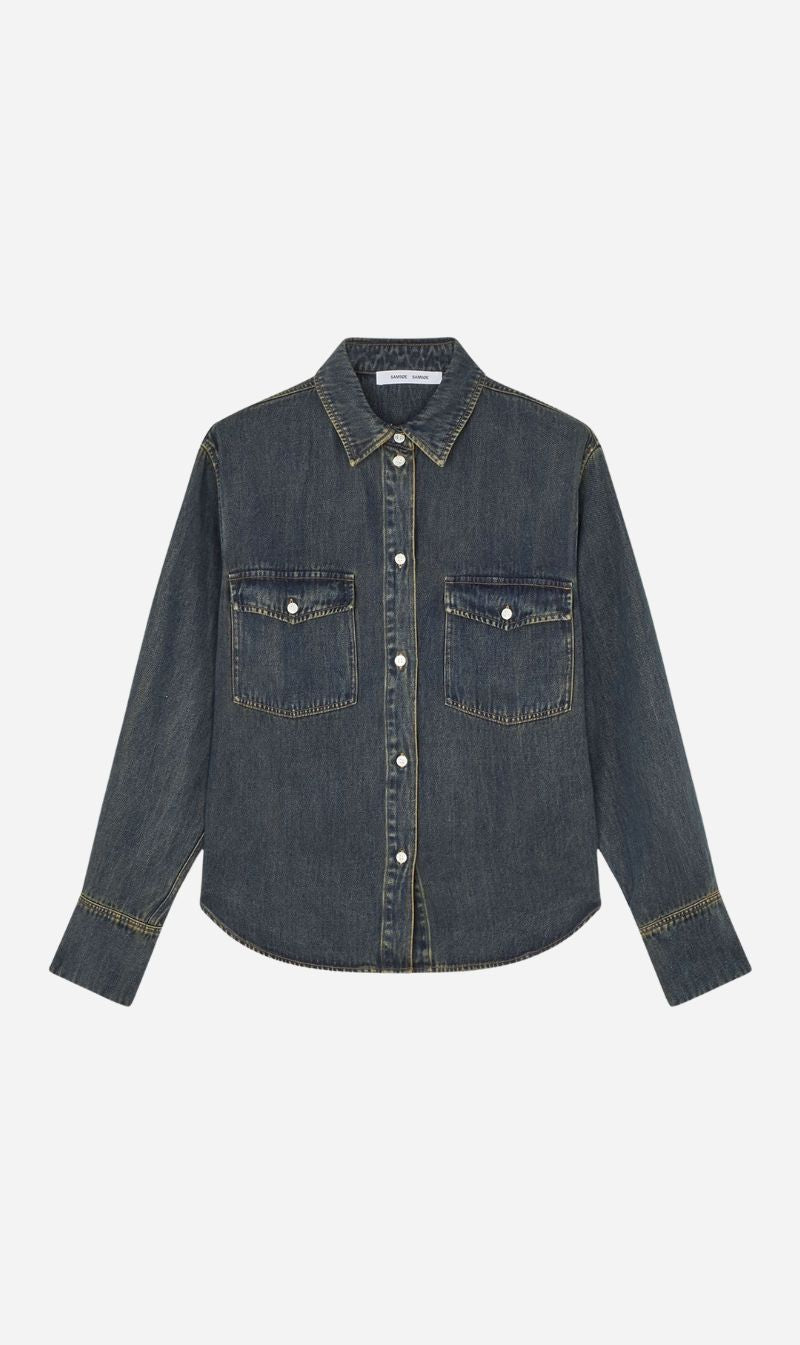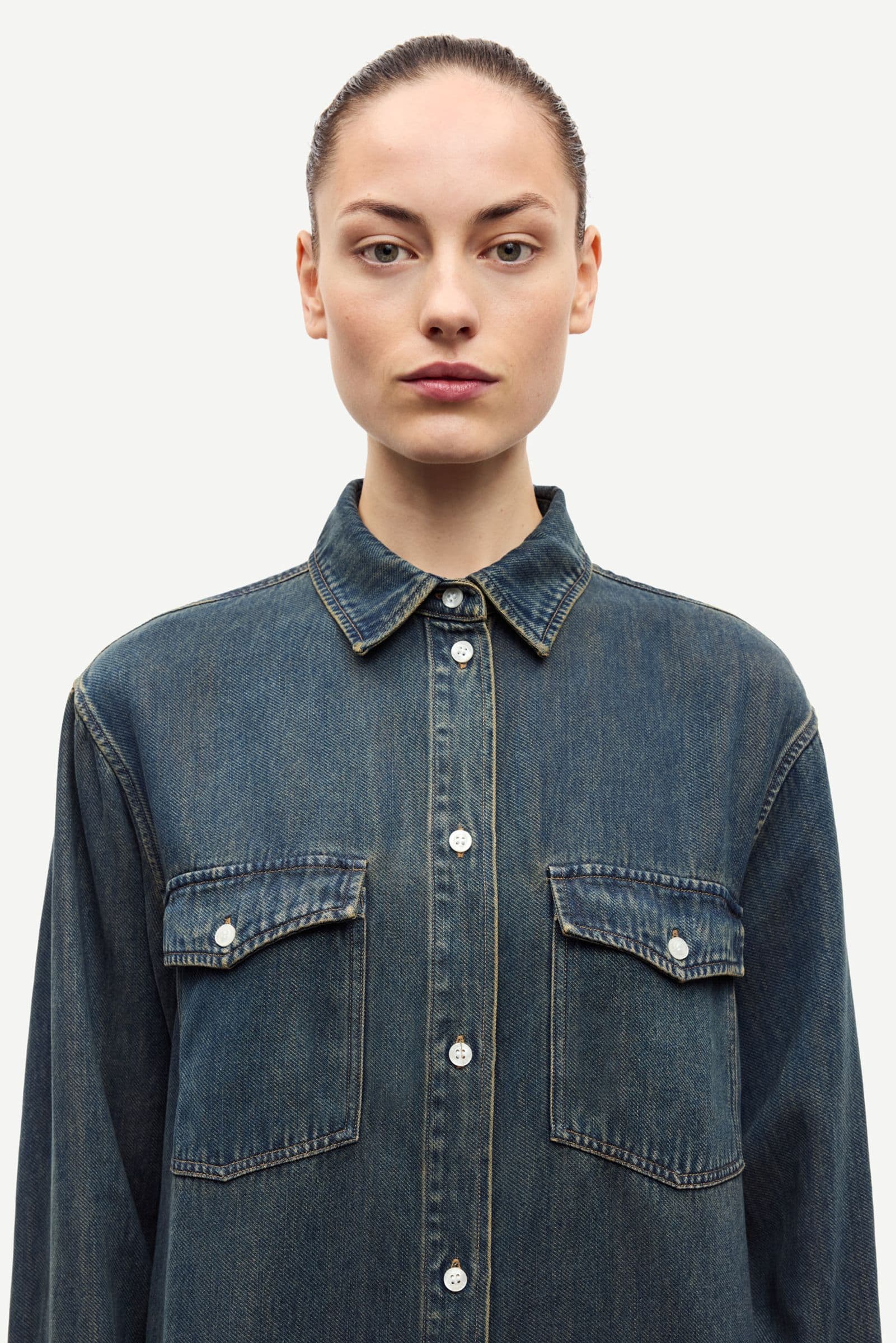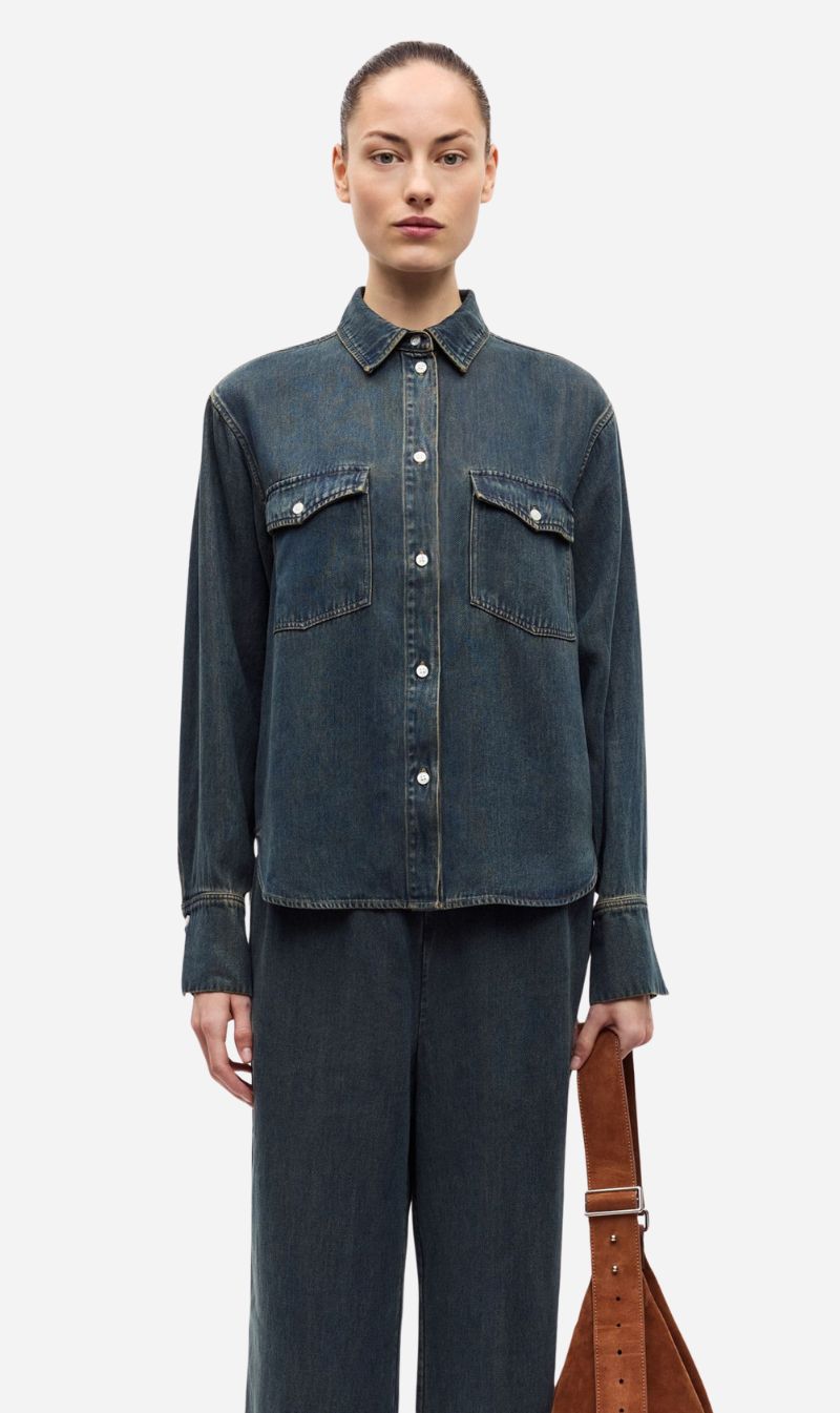 Long-sleeved shirt with a regular fit and dropped shoulders. Button closure on the front and buttoned cuffs. Buttoned patch pockets on the chest. Logo branded buttons at all placements. Neck yoke seam. Denim look with dark wash. Main material made from 100% TENCEL™ Lyocell. This product contains TENCEL™ Lyocell, certified with the EU Ecolabel for textile products (licence no. AT/016/001) for environmental excellence.