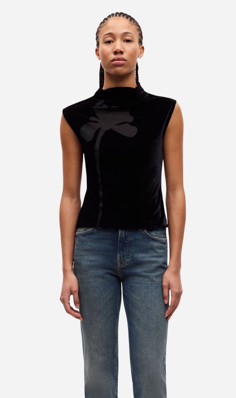 Velvet top with a slim fit and sheer floral detailing. High neck. Main material made from an elastic recycled polyester blend. This product is GRS certified. Each stage of the supply chain has met strict social, environmental, and chemical requirements.
