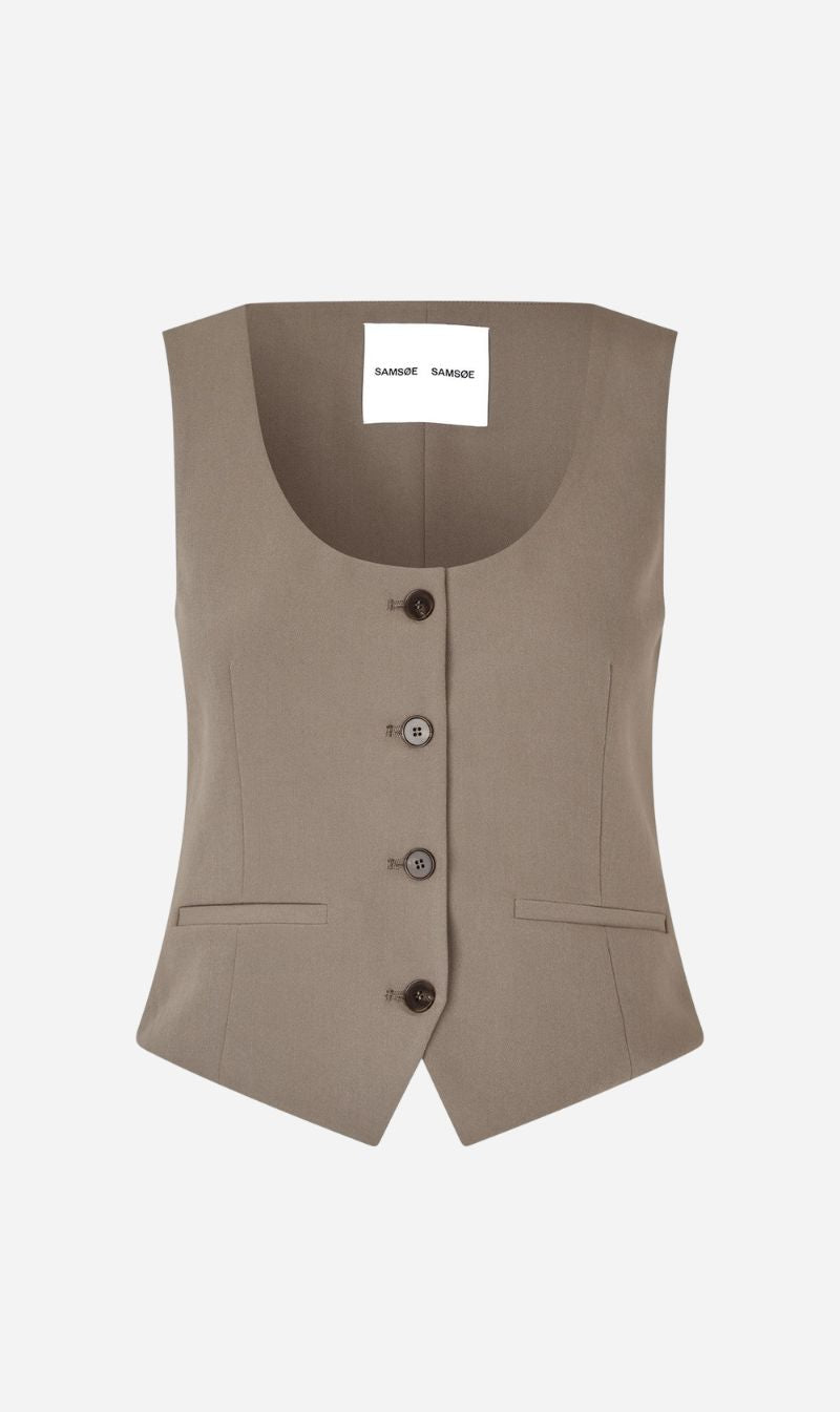 Vest with a slim fit. Single-breasted button closure on the front. Faux welt pockets on the front. Round neck. Fully lined. Main material made from an elastic recycled polyester blend. This product is GRS certified. Each stage of the supply chain has met strict social, environmental, and chemical requirements.