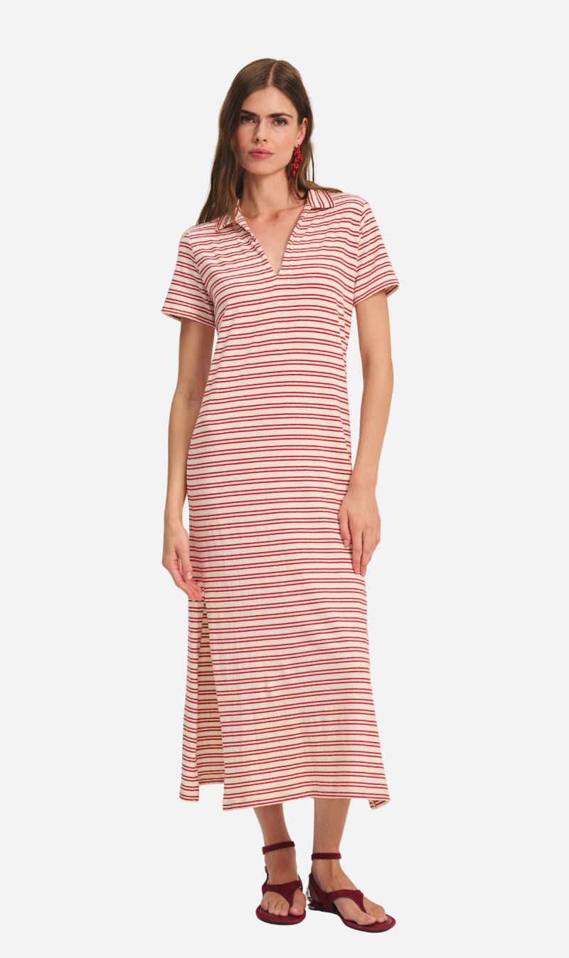 The Corin 07 Dress by Velvet is a casual yet refined T-shirt dress crafted from soft yarn-dyed stripe jersey. With a V-neckline, short sleeves, and a side split hem, it offers relaxed ease and everyday comfort.