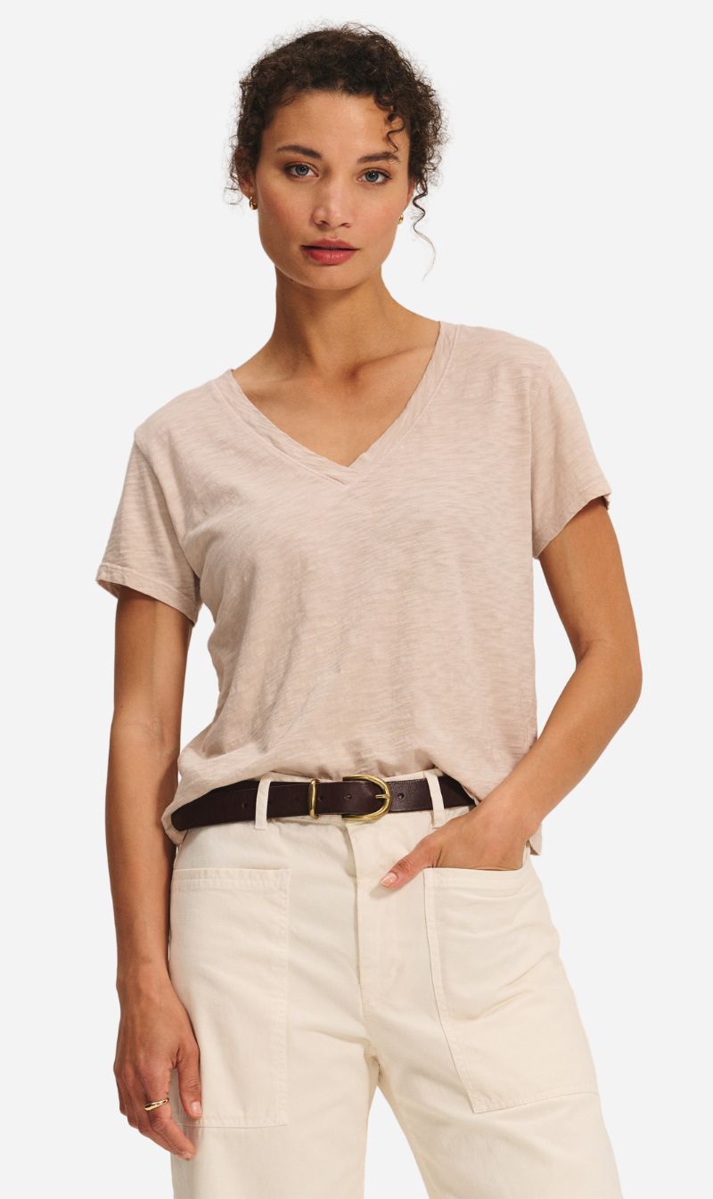 Crafted from premium cotton slub fabric, this tee delivers an elevated take on everyday comfort. Designed with a flattering V-neckline and short sleeves, it offers a timeless silhouette that pairs effortlessly with anything in your wardrobe. Versatile, easy to wear, and effortlessly stylish — this is the staple tee you’ll reach for again and again.