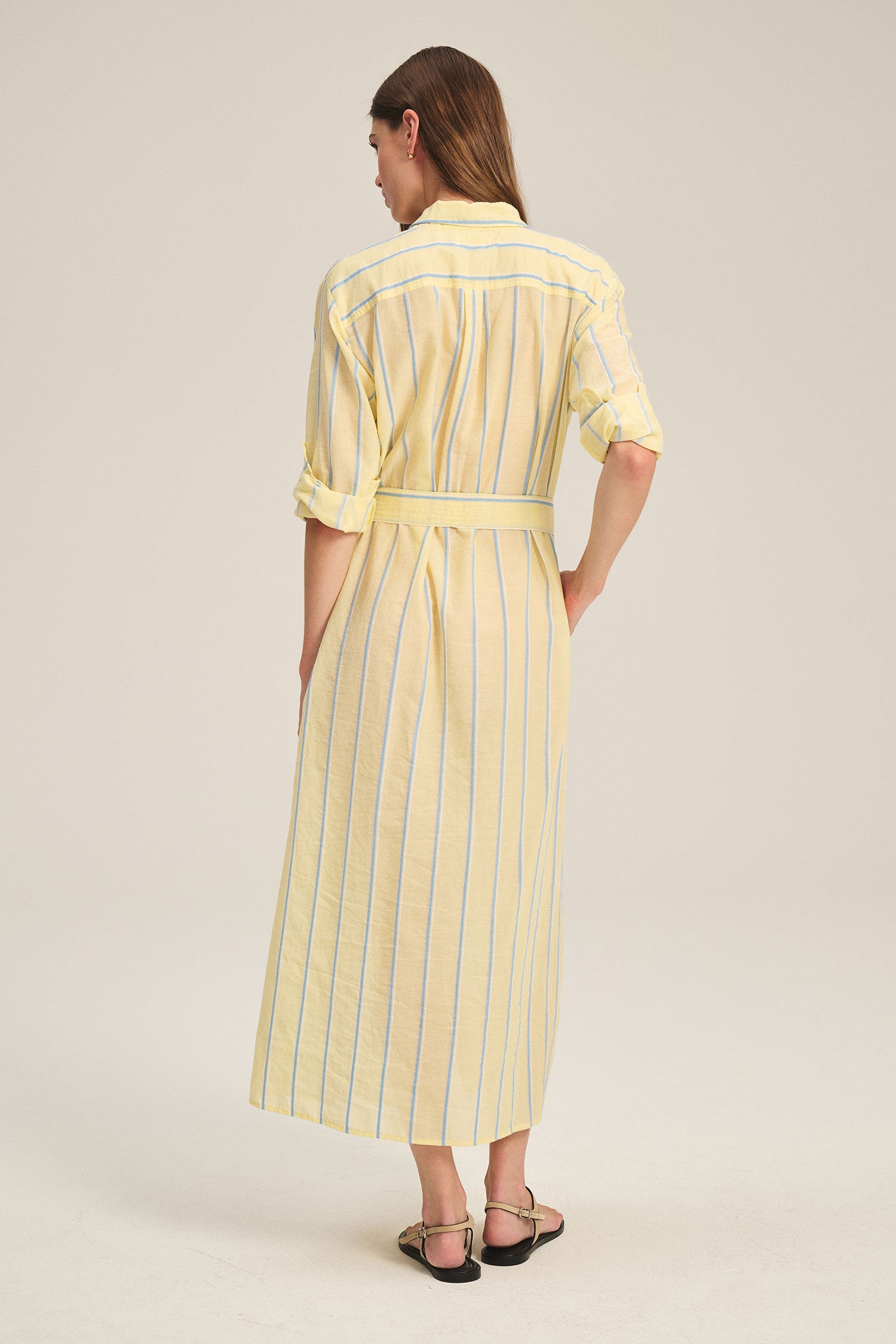 The Kimora Dress by Velvet is a lightweight, striped midi dress designed with effortless style in mind. Featuring a collared neckline, long sleeves with button cuffs, and an optional self-tie belt, it offers a versatile silhouette for day-to-night wear.