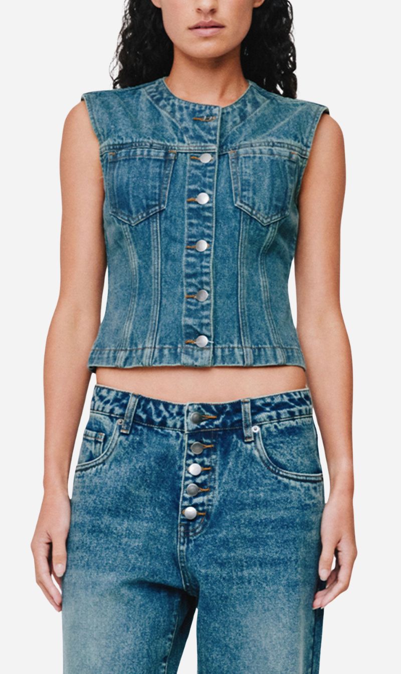 Sleeveless denim vest top with panels for shape.