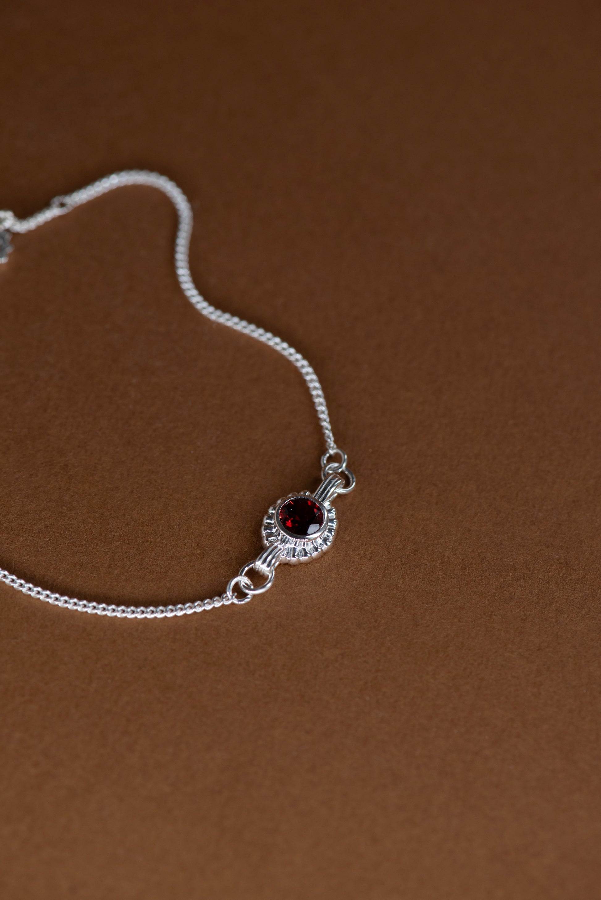 The Odette Bracelet is inspired by the intricate beauty of vintage jewellery, a piece with timeless details. It features a bezel set, round cut Garnet at its centre, with a contrasting border, designed to highlight the stone's natural shape. This border effortlessly flows into the jumpings, enhancing every element with intentional design. Garnets are associated with love and friendship due to their symbolism of the heart, inner fire, and life force. Crafted from recycled 925Sterling Silver and expertly plated in 22k Gold Vermeil, this vintage-inspired bracelet is a versatile addition to any collection. Perfect for gifting, this piece can be worn alone for a minimalist look or layered with sentimental pieces for a personalised story.