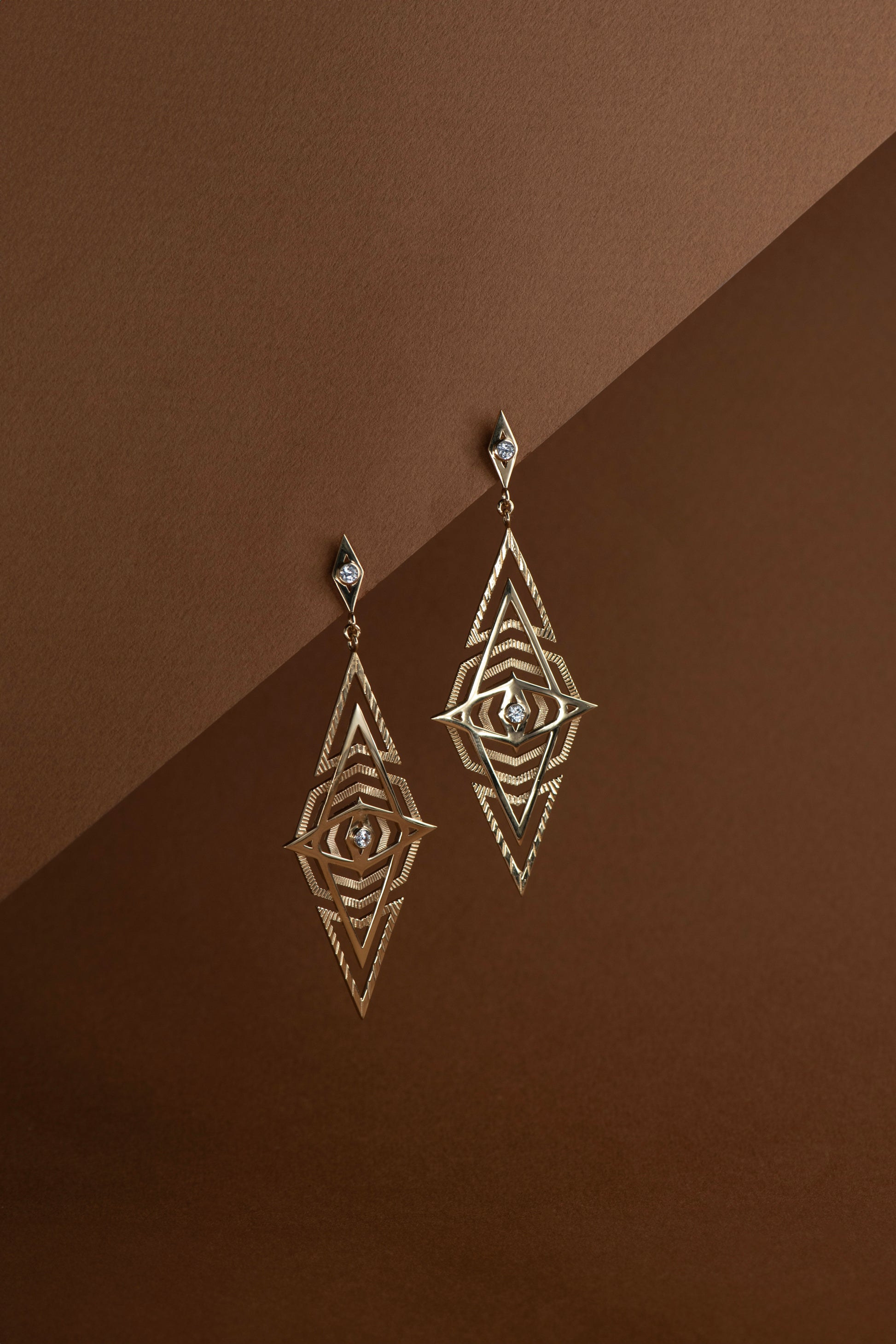 Released in 2019 from the You are the Sky collection, the VolcanoEarrings are a captivating blend of Art Deco elegance and elemental power. Inspired by Nepal's majestic mountains and Bali's Agung volcano, these geometric earrings embody nature's primal energy -both creation and destruction. Crafted from recycled 925 Sterling Silver and plated in 22k Gold Vermeil, each earring showcases a series of interlocking geometric shapes, while a sparkling White Zircon at the centre captures the earth's radiant energy and offers a powerful talisman of protection and intuition. Carry the magnificent spirit of the earth and your own unyielding strength with these unique statement earrings.